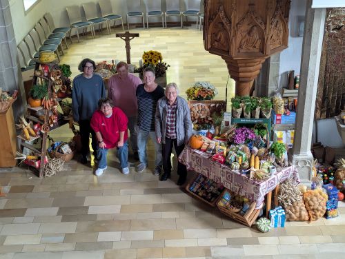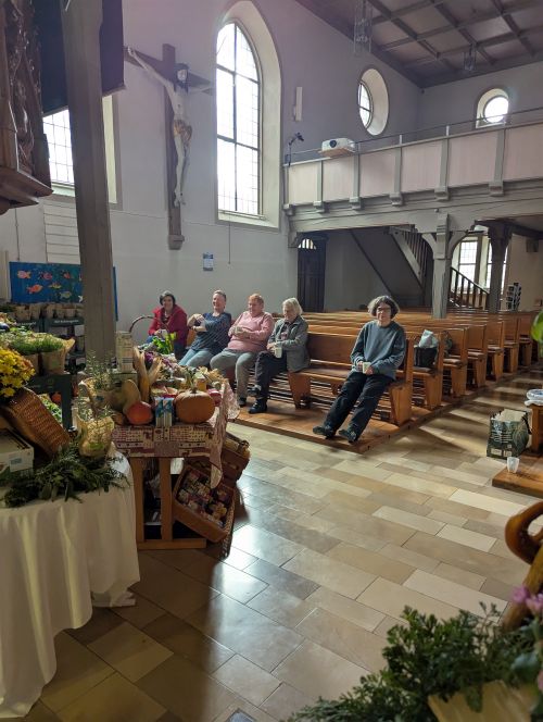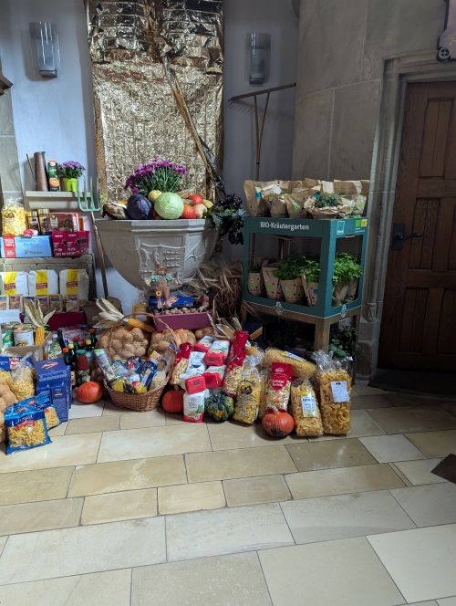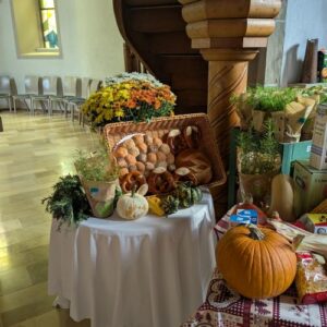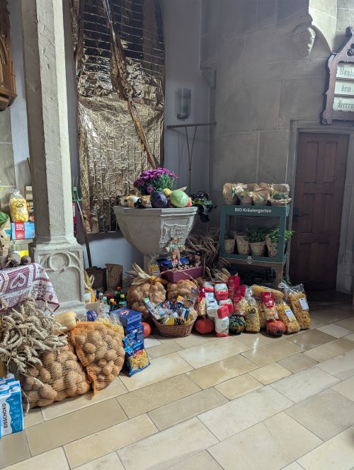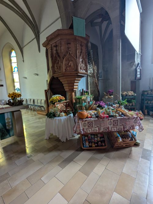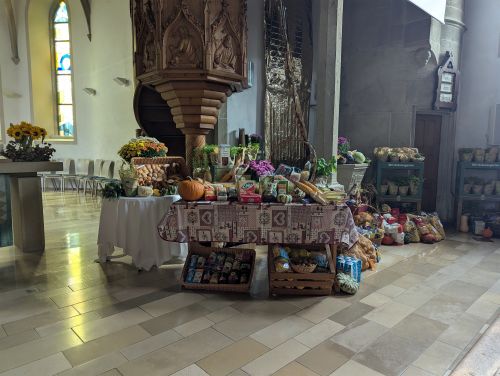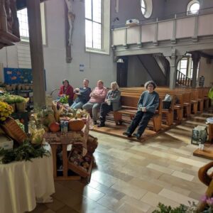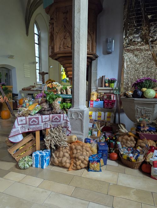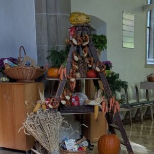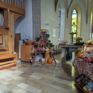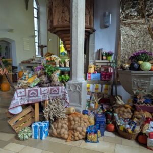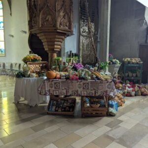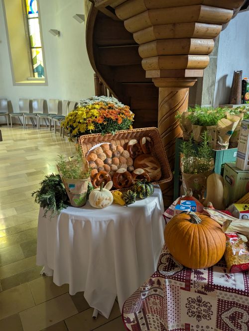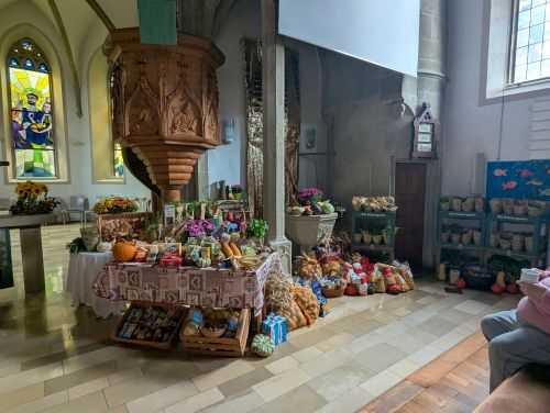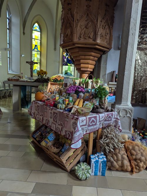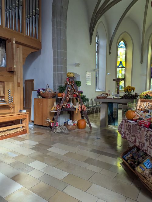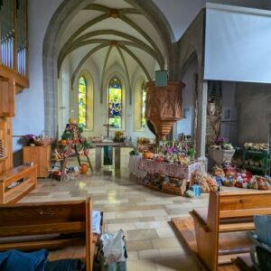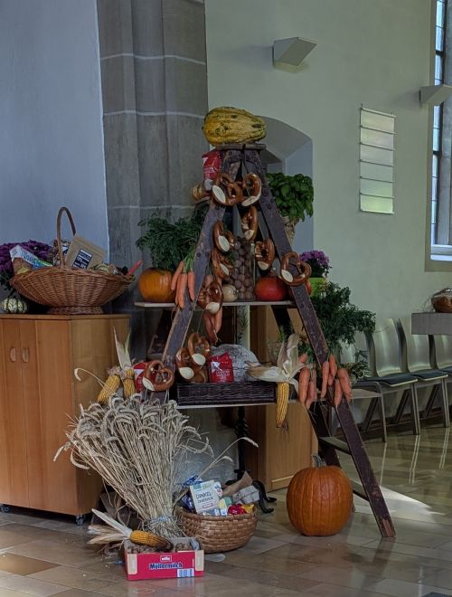 Am Samstag, 11.10.2025 durften wir wieder die Januariuskirche zum Erntedankfest dekorieren. Als wir gegen 14:00 Uhr in die Kirche kamen, waren wir wieder sehr gespannt, was in diesem Jahr an Spenden – und damit an „Dekomaterial“ – uns erwarten würde. Wir wurden auch in diesem Jahr wahrlich nicht enttäuscht! Nun hieß es für uns all die Gaben an Kürbissen, Äpfel, Birnen, Quitten, Kartoffeln, Nudeln, Mehl, Zucker, jede Menge frische Kräuter, Blumen, Stroh, Brote und Brezeln und noch vieles mehr zusammen mit den vorhandenen Deko-Elementen wie z. B. einer Bockleiter, Tischen, Tischtücher, Körbe u.ä. zusammenzubringen. Nachdem wir uns einen Überblick über die vielen Sachen verschafft haben, legten wir also los. Es wurde gebündelt, gestapelt, sortiert, angebunden, drapiert, verziert … Es hat wieder sehr viel Spaß gemacht! Danke an dieser Stelle an alle Helfer, Unterstützer und ganz besonders vielen lieben Dank an ALLE Spender/innen!! Die „Tafel“ in Marbach wird sich auch dieses Jahr sehr über diese vielfältigen und reichhaltigen Lebensmittelspenden gefreut haben!