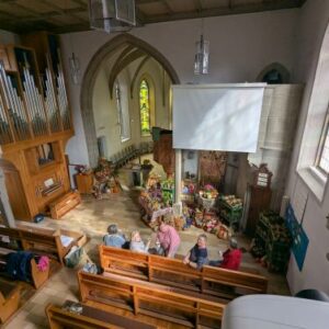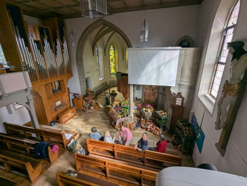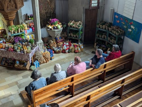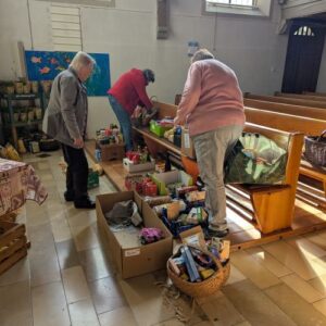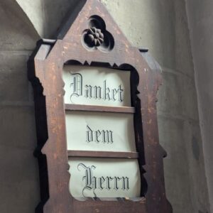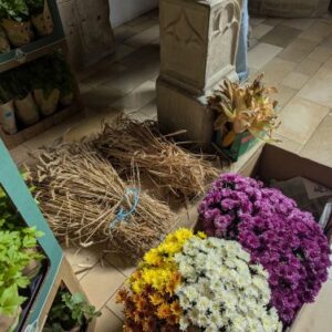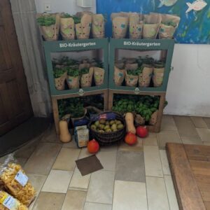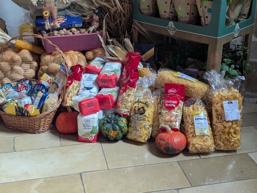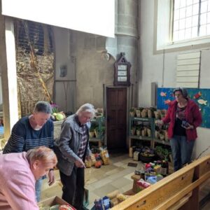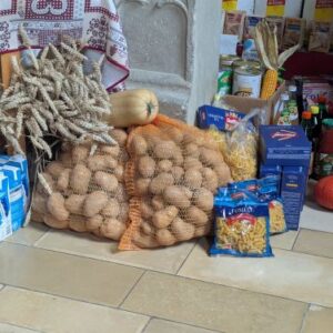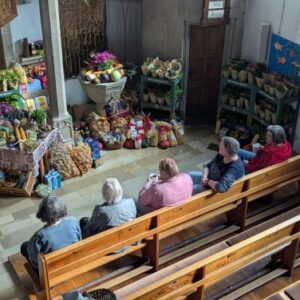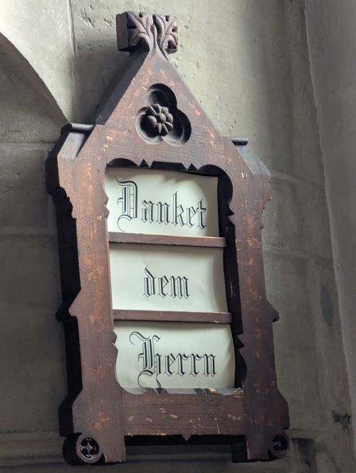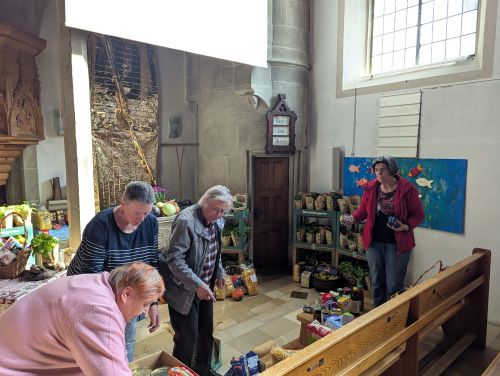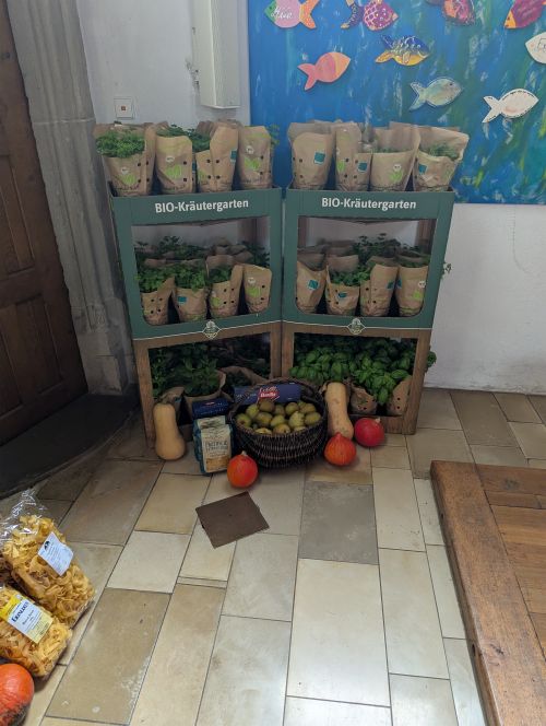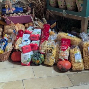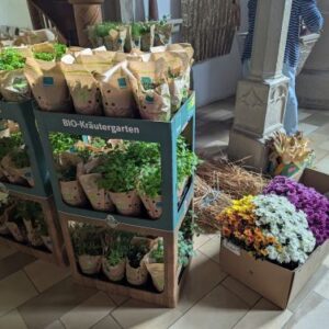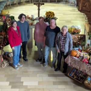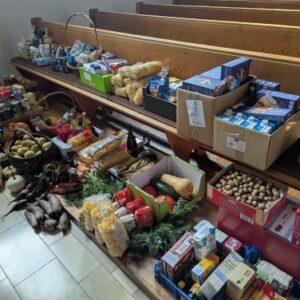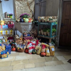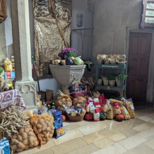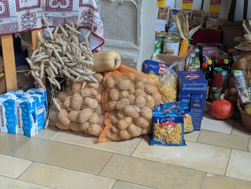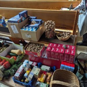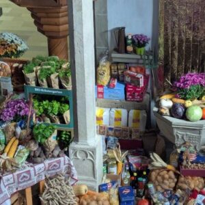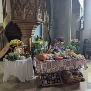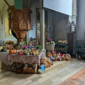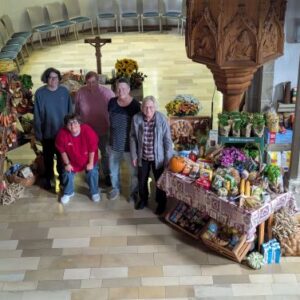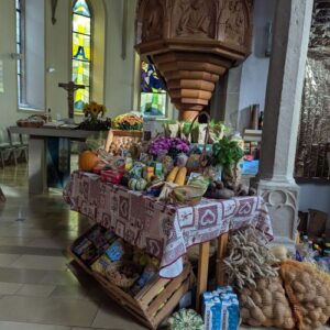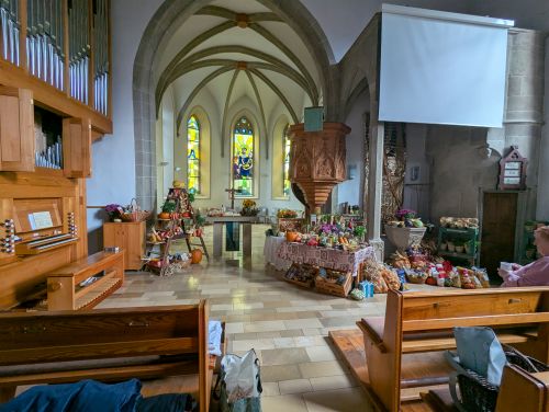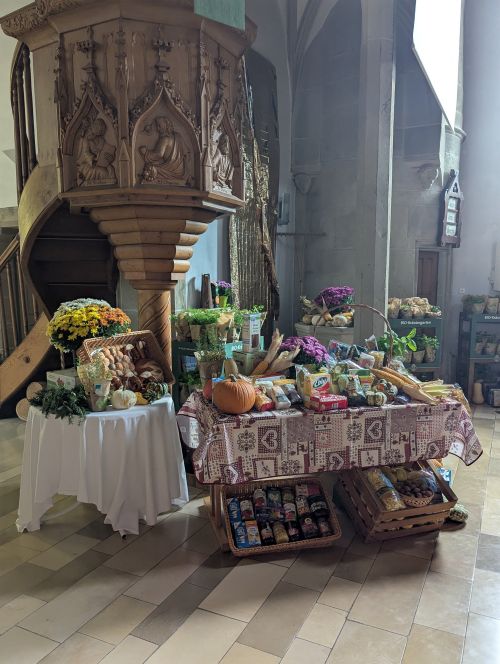 Am Samstag, 11.10.2025 durften wir wieder die Januariuskirche zum Erntedankfest dekorieren. Als wir gegen 14:00 Uhr in die Kirche kamen, waren wir wieder sehr gespannt, was in diesem Jahr an Spenden – und damit an „Dekomaterial“ – uns erwarten würde. Wir wurden auch in diesem Jahr wahrlich nicht enttäuscht! Nun hieß es für uns all die Gaben an Kürbissen, Äpfel, Birnen, Quitten, Kartoffeln, Nudeln, Mehl, Zucker, jede Menge frische Kräuter, Blumen, Stroh, Brote und Brezeln und noch vieles mehr zusammen mit den vorhandenen Deko-Elementen wie z. B. einer Bockleiter, Tischen, Tischtücher, Körbe u.ä. zusammenzubringen. Nachdem wir uns einen Überblick über die vielen Sachen verschafft haben, legten wir also los. Es wurde gebündelt, gestapelt, sortiert, angebunden, drapiert, verziert … Es hat wieder sehr viel Spaß gemacht! Danke an dieser Stelle an alle Helfer, Unterstützer und ganz besonders vielen lieben Dank an ALLE Spender/innen!! Die „Tafel“ in Marbach wird sich auch dieses Jahr sehr über diese vielfältigen und reichhaltigen Lebensmittelspenden gefreut haben!